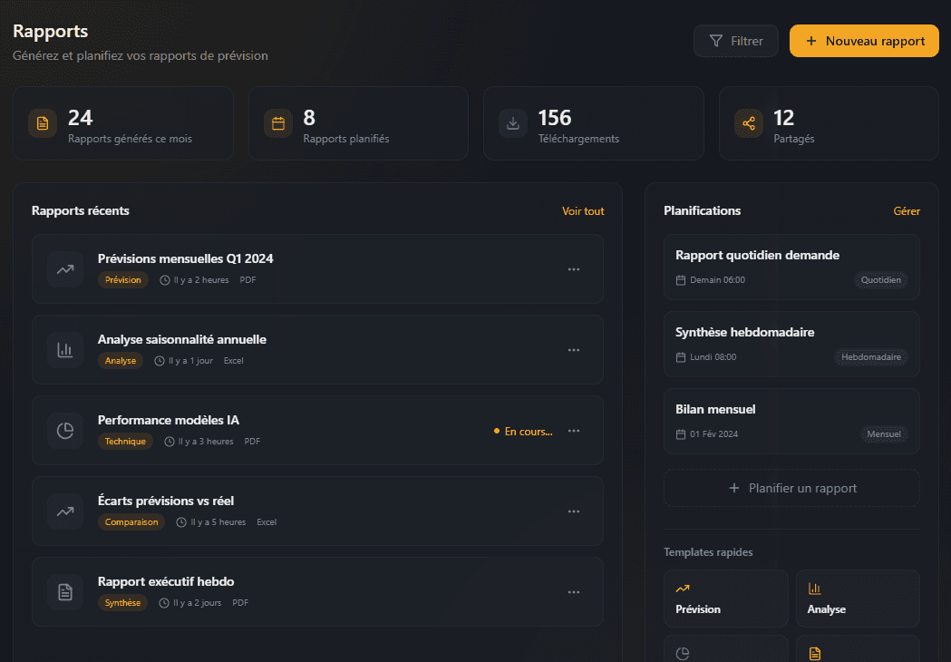 • Accès centralisé aux analyses de demande, saisonnalité et performance des modèles IA.