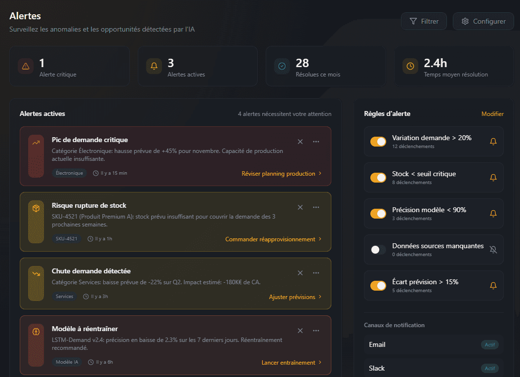 • Tableau de bord de surveillance des anomalies et opportunités détectées par l’IA.